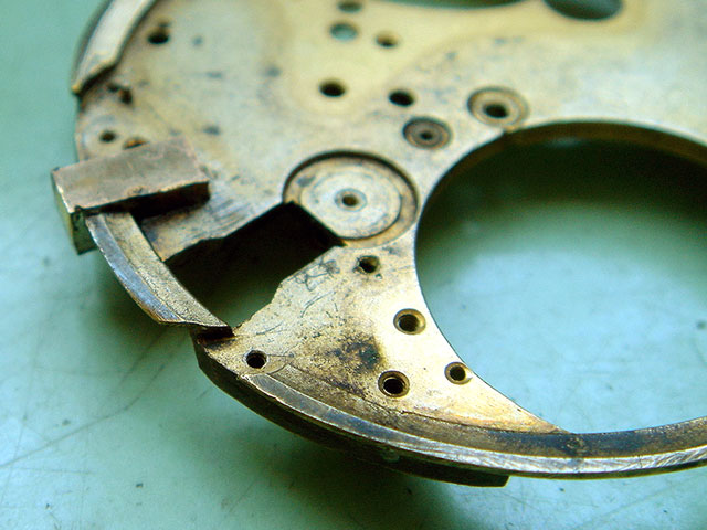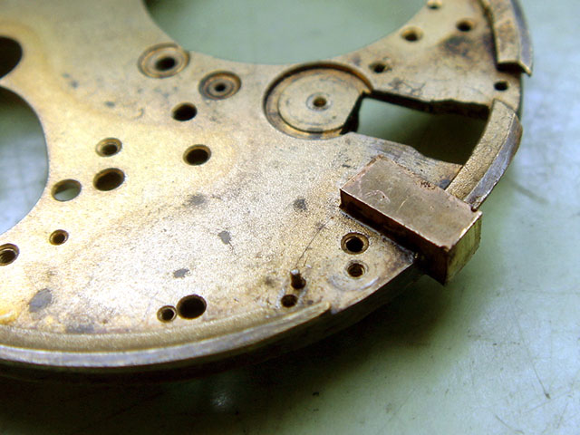 The cutout is to line by a piece of brass and with silver solder to braze. The silver plating, frosted surface, gets lost and must be renewed later, is also valid for the gold plating. Here in this case it is possible to treat the pillar plate in such a way. The warmth while soldering procedure does change the hardness of the brass nevertheless the remaining condition.